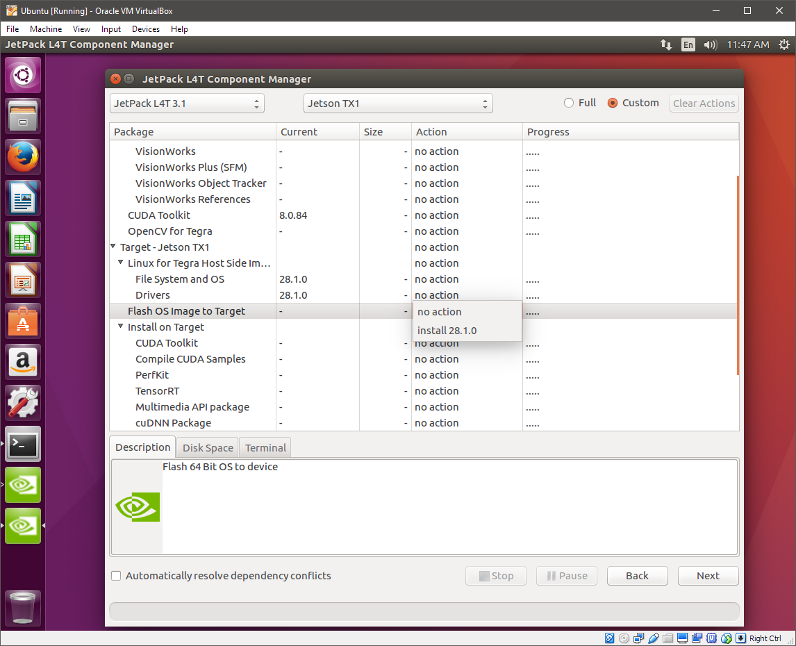 Run through the initial installer setup until you get to the JetPack Component Manager. There, first choose “Clear Actions” to unselect all the other options. We’re here to Flash OS Image to Target so find that option and click on the action column. Choose install and choose to include the dependencies. Click next then Accept the Terms and Conditions.