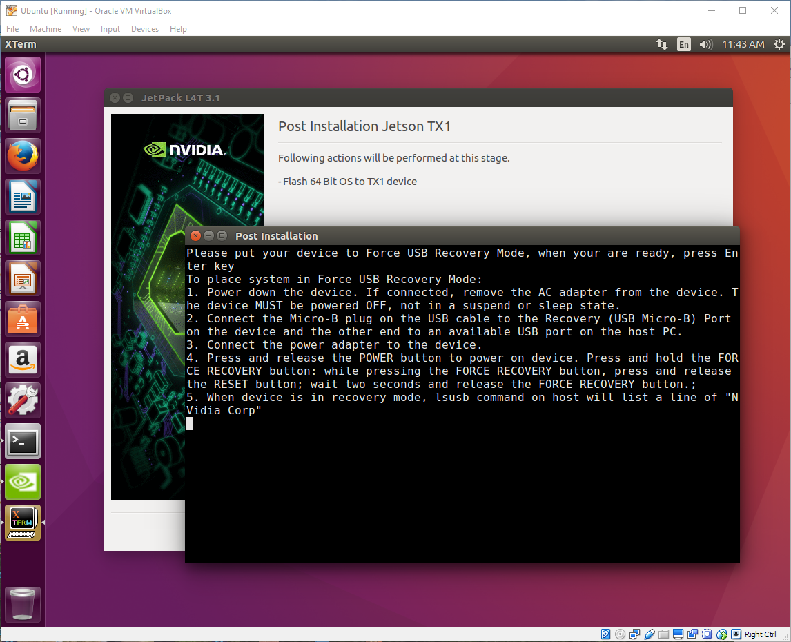 The Jetson TX1 requires a special version of Ubuntu which can be installed through a program called Jetpack. The catch here is you need to run Jetpack on a separate Linux computer while the Jetson TX1 is connected via USB and in Recovery Mode. Not currently having Linux setup on any of my computers, I wanted to do this through a VM on my Windows machine.