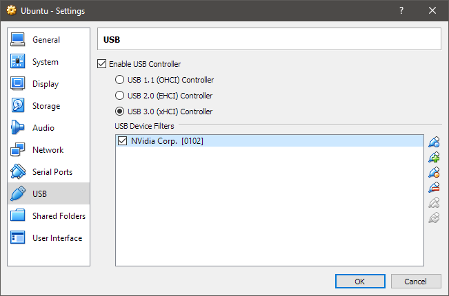 Finally, you need to setup the USB passthrough in VirtualBox. Select your Ubuntu VM and open its Settings panel. Go to the USB screen and hit the USB icon with a green plus next to the USB Device Filters list. If your Jetson TX1 is properly connected to your computer and in Recovery Mode, NVidia Corp. should appear on the dropdown list. Select it. If it does not appear, try the Recovery Mode instructions again.